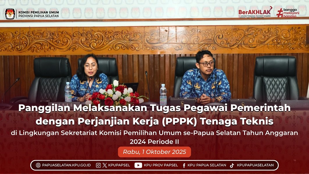 #TemanPemilih, KPU Provinsi Papua Selatan bersama KPU Kabupaten se-Papua Selatan melaksanakan Panggilan Melaksanakan Tugas Pegawai Pemerintah dengan Perjanjian Kerja (PPPK) Tenaga Teknis dan Tenaga Kesehatan di Lingkungan Sekretariat Jenderal Komisi Pemilihan Umum Tahun Anggaran 2024 Periode II, di lingkungan Sekretariat KPU Provinsi dan Kabupaten se-Papua Selatan.