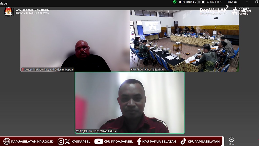 Turut hadir dalam rapat ini Anggota Bawaslu Provinsi Papua Selatan Ahmad Muhazir bersama jajaran staf, Kepala Seksi Dinas Kependudukan dan Pencatatan Sipil Provinsi Papua Selatan Basuki, LO Polda Papua Putu S. Arnaya, Sandhy Ardya yang mewakili Komandan Lanud J.A. Dimara, serta perwakilan dari Divisi Keimigrasian dan Divisi Pemasyarakatan Kantor Wilayah Kementerian Hukum dan HAM Papua Selatan yang mengikuti secara daring melalui Zoom Meeting.