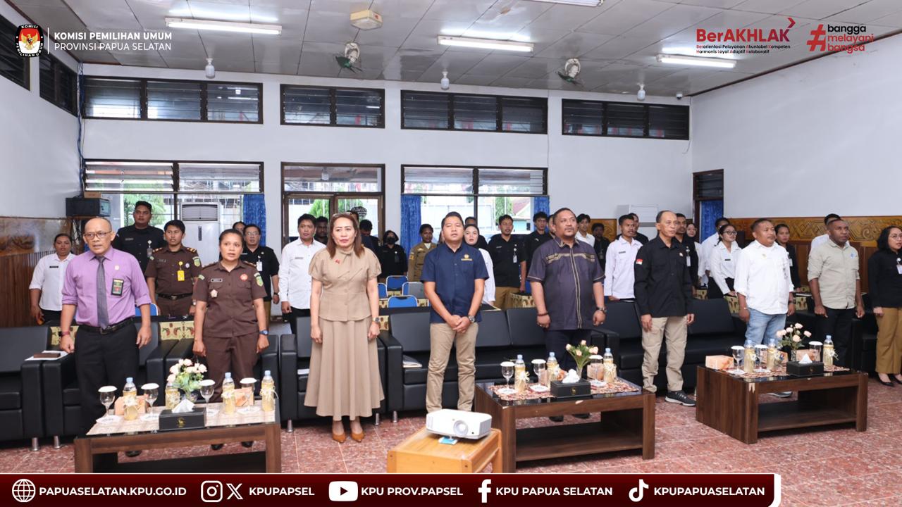 Turut Hadir dalam kegiatan Ketua Bawaslu Provinsi Papua Selatan, Ketua Pengadilan Negeri Merauke, Kepala Kejaksaan Negeri Merauke, perwakilan L.O. Polda Papua, serta jajaran staf Sekretariat KPU Provinsi Papua Selatan.