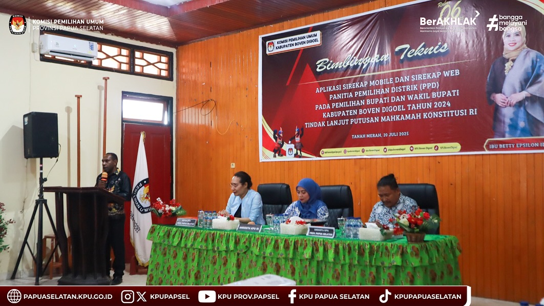 #TemanPemilih, KPU Provinsi Papua Selatan turut mendampingi kunjungan kerja Anggota KPU RI, Betty Epsilon Idroos, bersama jajaran Pusat Data dan Informasi (Pusdatin) KPU RI, dalam kegiatan Bimbingan Teknis Aplikasi Sirekap Mobile dan Web bagi Panitia Pemilihan Distrik (PPD) untuk Pemungutan Suara Ulang Pemilihan Bupati dan Wakil Bupati Kabupaten Boven Digoel Tahun 2024. Kegiatan ini berlangsung di Boven Digoel, Minggu (20/07/2025).