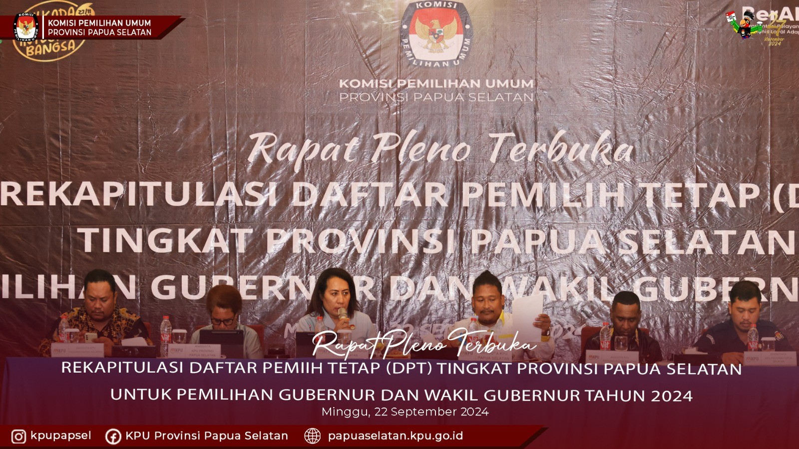 Rapat Pleno Terbuka Penetapan Daftar Pemilih Tetap (DPT) untuk Pemilihan Gubernur Dan Wakil Gubernur Tahun 2024 dibuka Oleh Ketua KPU Provinsi Papua Selatan Theresia Mahuse yang di dampingi Oleh Anggota KPU Provinsi Papua Selatan Divisi Teknis Penyelenggara Helda Richarda Ambay, Anggota KPU Provinsi Papua Selatan Divisi Perencanaan Data Dan Informasi Daniel Ndiwaen, Anggota KPU Provinsi Papua Selatan Divisi Hukum Dan Pengawasan Jufri Toatubun, Anggota KPU Provinsi Papua Selatan Divisi Sosialisasi Pendidikan Pemilih, Partisipasi Masyarakat Dan SDM Alson Markus Kambu Dan Sekretaris KPU Provinsi Papua Selatan Jimmy Winarta.