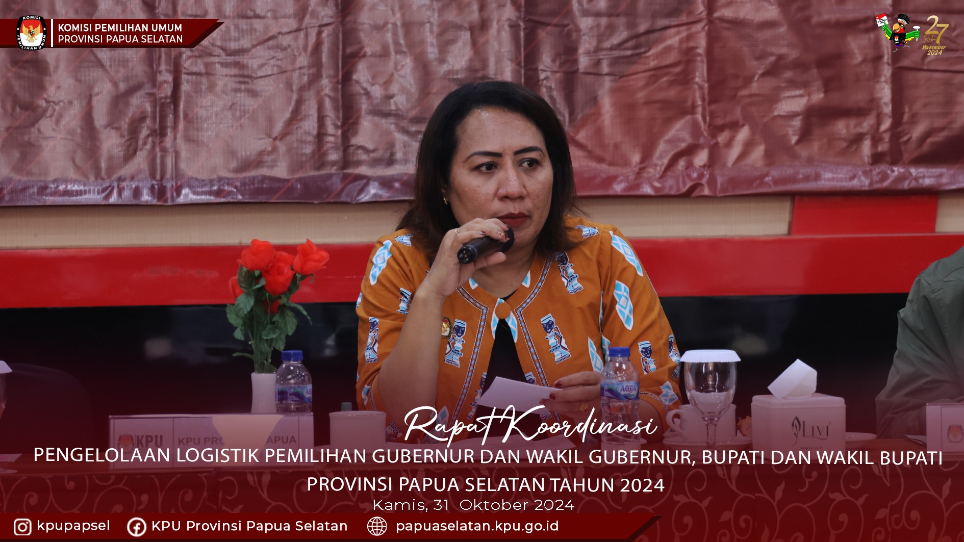 #Temanpemilih, Ketua KPU Provinsi Papua Selatan Theresia Mahuse membuka kegitan Rapat Koordinasi Pengelolaan Logistik Pemilihan Gubernur Dan Wakil Gubernur, Bupati Dan Wakil Bupati Provinsi Papua Selatan Tahun 2024 bertempat di Hotel Halogen Merauke. (Kamis,31/10/2024).