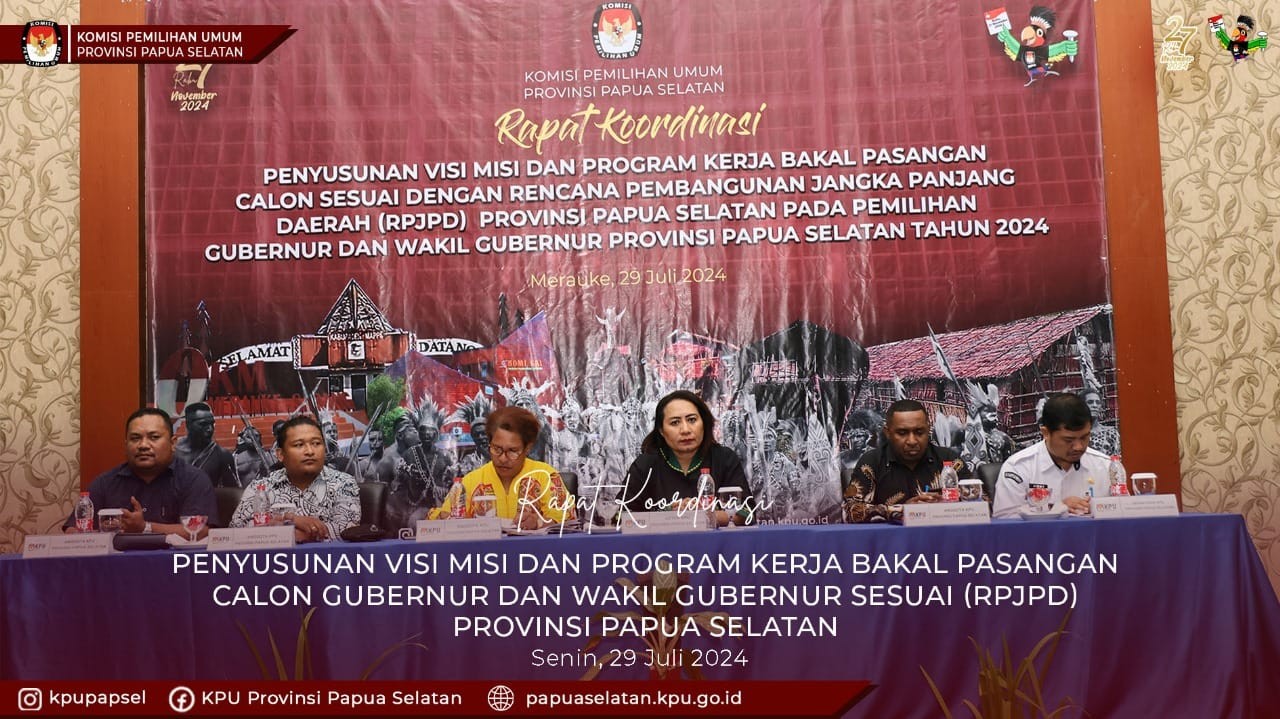 #temapemilih, KPU Provinsi Papua Selatan Melakukan kegiatan Rapat Koordinasi Penyusunan Visi Misi dan Program Kerja Bakal Pasangan Calon Sesuai dengan Rencana Pembangunan Jangka Panjang Daerah (RPJPD) Provinsi Papua Selatan pada Pemilihan Gubernur dan Wakil Gubernur Provinsi Papua Selatan Tahun 2024. Merauke, 29 Juli 2024. Ketua KPU Provinsi Papua Selatan Theresia Mahuse memberikan sambutan sekaligus membuka kegiatan Rapat Koordinasi “Hari ini, Senin, 29 Juli 2024, kita hadir dalam rapat koordinasi penyusunan visi, misi, dan program kerja bakal pasangan calon gubernur dan wakil gubernur Papua Selatan. Pilkada serentak 2024 akan berlangsung dalam 4 bulan. Tahapan yang berjalan saat ini termasuk pemungutan data dan coklit (24 Juni - 24 Juli). Selanjutnya, penyusunan daftar pemilih yang akan direkap oleh TPS hingga provinsi, dengan penetapan DPS (15-17 Agustus) dan finalnya DPT pada September. Tahapan pencalonan akan dibuka pada 27-29 Agustus untuk pasangan calon dari partai politik atau gabungan partai politik. Dokumen persyaratan akan diverifikasi sesuai PKPU-8 Tahun 2024. Persyaratan calon termasuk setia kepada Pancasila, minimal usia 30 tahun untuk gubernur dan wakil gubernur, serta pendidikan minimal SMA/sederajat. Persyaratan pencalonan meliputi penyampaian naskah visi, misi, dan program sesuai RPJP Daerah. Undang-undang 10 Tahun 2016 mengharuskan pemerintah daerah mendukung Pilkada dengan menyediakan data dan informasi terkait pembangunan daerah, RPJMD, serta rekomendasi teknokrat. Informasi ini digunakan calon untuk menyusun visi, misi, dan program prioritas mereka” Kemudian dilanjutkan dengan sambutan dan materi oleh Ketua Divisi Teknis Penyelenggaraan Pemilu Helda Richarda Ambay. Pada tahun 2024, Provinsi Papua Selatan akan melaksanakan Pemilihan Gubernur dan Wakil Gubernur Perdana Tahapan pencalonan dimulai dengan Pengumuman 24 sampai 26 Agustus dan tahapan pendaftaran pada tanggal 27 hingga 29 Agustus, Dalam proses pencalonan ini, terdapat dua syarat utama yang harus dipenuhi oleh setiap bakal pasangan calon, Yang pertama persyaratan pencalonan sesuai amanat Pasal 11 PKPU 8 Tahun 2024, : Partai Politik Peserta Pemilu atau Gabungan Partai Politik Peserta Pemilu dapat mendaftarkan Pasangan Calon jika telah memenuhi persyaratan perolehan paling sedikit 20% (dua puluh persen) dari jumlah kursi DPRD Provinsi atau minimal 7 kursi. Dari 18 partai politik peserta pemilu 11 partai politik yang memperoleh kursi di DPRD Provinsi yang mempunyai hak mencalonkan bakal calon kepala daerah. Selanjutnya partai politik atau gabungan partai politik yang memperoleh 25% (dua puluh lima persen)dari akumulasi perolehan suara sah dalam Pemilu anggota DPRD Provinsi 25% dari 308.864 atau setara dengan 77.216 suara sah. Paslon harus memiliki Visi Misi dan Program Kerja yang sejalan dengan Rencana Pembangunan Jangka Panjang Daerah (RPJPD). Kedua persyaratan Calon sesuai ketentuan pasal 14 PKPU 8 Tahun 2024. Selanjutnya pemaparan materi dari para narasumber Yustisianus Kamkerop Wiwaron, S.STP., MM. Badan Perencanaan Pembangunan Riset dan Inovasi Daerah Provinsi Papua Selatan, Yakobus Tunay, S.STP Badan Kesatuan Bangsa Dan Politik Provinsi Papua Selatan, dan Ahmad Muhazir, SE., M.Si., C.Med Bawaslu Provinsi Papua Selatan. Rapat Koordinasi (Rakor) juga diikuti oleh Sekretaris KPU Provinsi Jimmy Winarta, Kabag Tekmas Djumad juga sebagai moderator Rakor, Ketua dan Sekretaris 18 Partai Politik. a #kpumelayani #pilkadaserentak2024