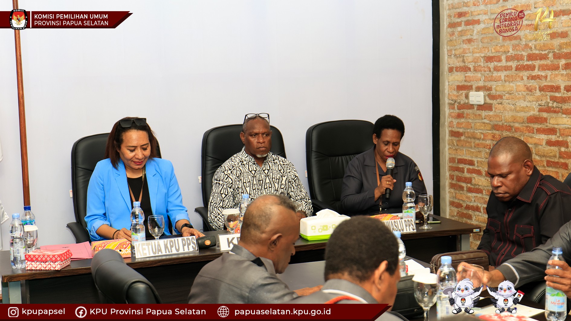 Ketua KPU Provinsi melaporkan jadwal dan tahapan pemilu baik yang telah dilaksankan maupun yang akan dilaksanakan. Pemaparan Daerah Pemilihan dan jumlah alokasi kursi di Provinsi Papua Selatan. Jumlah data pemilih dan TPS. Jumlah data badan ADHOC Se-Provinsi Papua Selatan 82 Distrik, 690 Kampung, 410 PPK, 387 Sekretariat PPK, 2.070 PPS dan Sekretariat PPS, 12.390 KPPS dan 3.540 Pengamanan TPS.