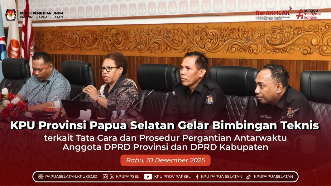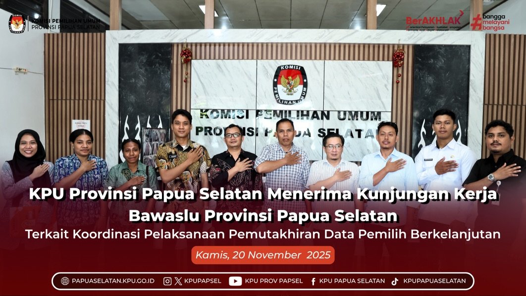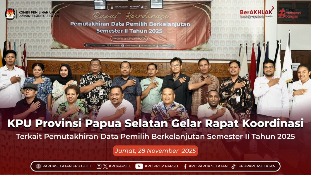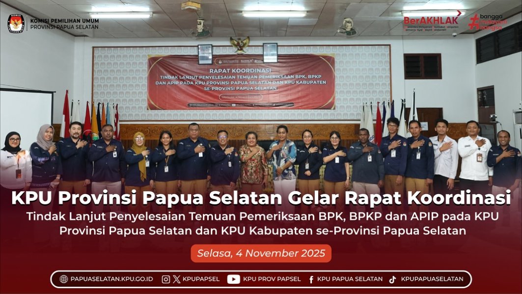 #TemanPemilih, KPU Provinsi Papua Selatan menggelar Rapat Koordinasi Tindak Lanjut Penyelesaian Temuan Pemeriksaan BPK, BPKP, dan APIP pada KPU Provinsi Papua Selatan dan KPU Kabupaten se-Provinsi Papua Selatan. Kegiatan ini dilaksanakan secara luring dan daring dari Kantor KPU Provinsi Papua Selatan, Selasa (4/11/2025).