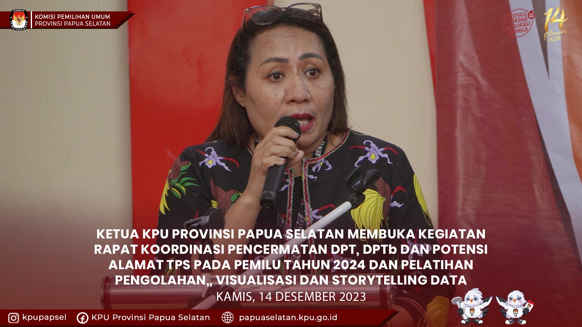 #TemanPemilih. KPU Provinsi Papua Selatan gelar kegiatan Rapat Koordinasi Pencermatan DPT, DPTb, dan Potensi Alamat TPS pada Pemilu Tahun 2024 dan Pelatihan Pengolahan, Visualisasi dan Storytelling Data bertempat di Hotel Halogen Merauke, 14-16 Desember 2023